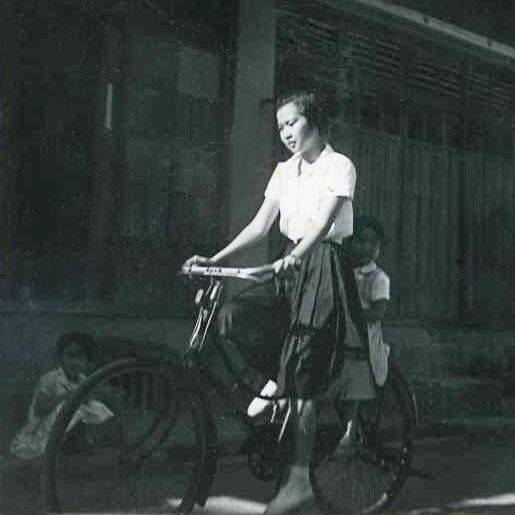 In this photo, you see 3 sisters: my big sister was riding the bike; my younger sister sat in the back; I was a happy observer. Believe it or not, that bike in the photo was the bike I used to learn how to bike.